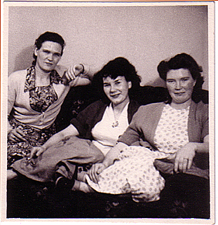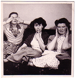 | Right:The three sisters - Billie, Joan, and Helena - being The Three Wise Monkeys - probably at Helena's first house in Wepener Place around 1948... |